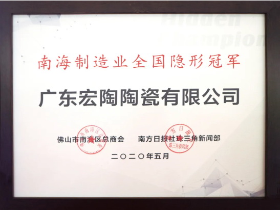 广东宏陶陶瓷有限公司名列“南海制造业全国隐形冠军企业”光荣榜
