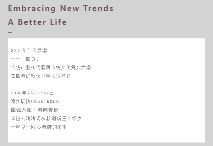 宏陶陶瓷的「潮向美好计划」 匠心潮牌风格与以往略有不同 集合了新、潮、玩的灵感 将打造个性原创空间理念 体现得淋漓尽致 2020年7月20-24日 砖业弄潮 诚意相邀