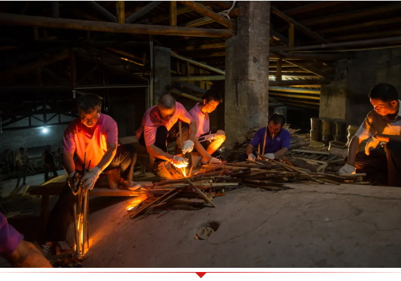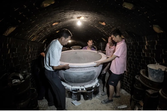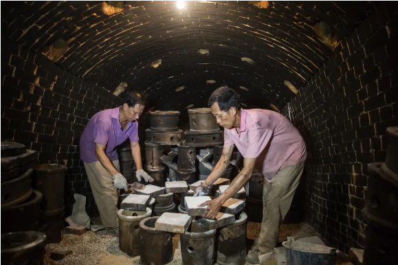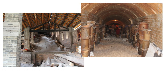 窑工烧窑时首先用大木头在炉头烧火,称为 “挤火”,通常要3-5个小时,至整个窑腔由持续升温到800度左右