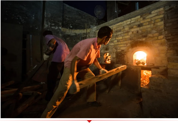 窑工在炎热的窑背上从第3排开始,由低至高,一排一排地依次序把小木柴投进火眼,窑炉迅速升温,“火膛”通红,温度高达1300度